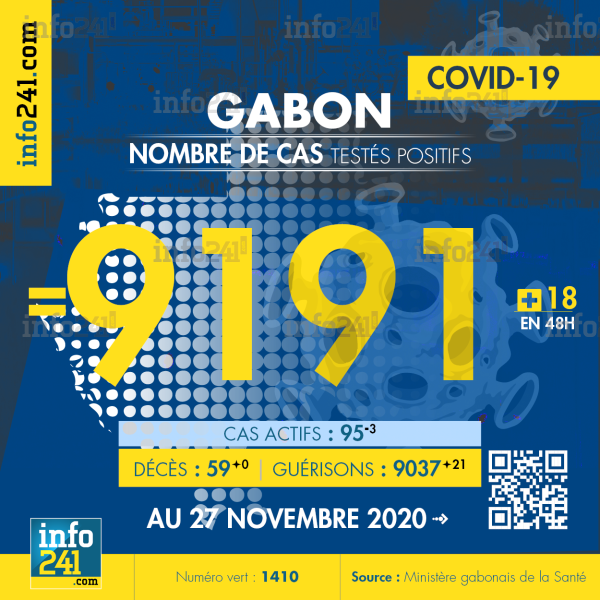 Ce qui porte le bilan à 9 191 cas confirmés, 59 décès et 9 037 guérisons. Le Gabon compte actuellement 95(-3) cas actifs de la pandémie officiellement déclarés. Parmi eux 9(+1) patients hospitalisés dans le pays dont 8(+1) en réanimation.
