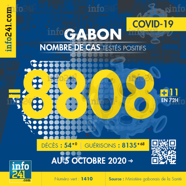 Ce qui porte le bilan à 8 808 cas confirmés, 54 décès et 8 135 guérisons. Le Gabon compte actuellement 619(-57) cas actifs de la pandémie officiellement déclarés. Parmi eux 3(-0) patients hospitalisés dans le pays dont 3(-0) en réanimation.