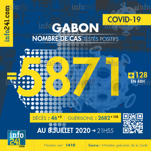 Bilan épidémiologique du Gabon au 8 juillet 2020 : 128 nouveaux cas enregistrés en 48h dans l’Estuaire (57 cas), le Haut-Ogooué (7 cas), le Moyen-Ogooué (4 cas), la Ngounié (16 cas), l’Ogooué-Lolo (24 cas), le Woleu-Ntem (13 cas) et l’Ogooué-Maritime (8 cas). Il y a eu aucun nouveau décès et 108 nouvelles guérisons. Ce qui porte le bilan à 5 871 cas confirmés, 46 décès et 2 682 guérisons. Il y a actuellement 3 143 cas actifs. Parmi eux 36(-11) patients hospitalisés dans le pays dont 7(-4) en réanimation.