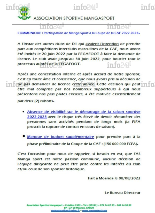 « A l’instar des autres clubs de D1 qui avaient l’intention de prendre part aux compétitions interclubs masculines de la CAF, nous avons été invités le 20 juin 2022 par la FEGAFOOT à faire la demande de licence. Le club avait jusqu’au 30 juin 2022, pour boucler tout le processus auprès de la FEGAFOOT », explique le club minier dans son communiqué.
