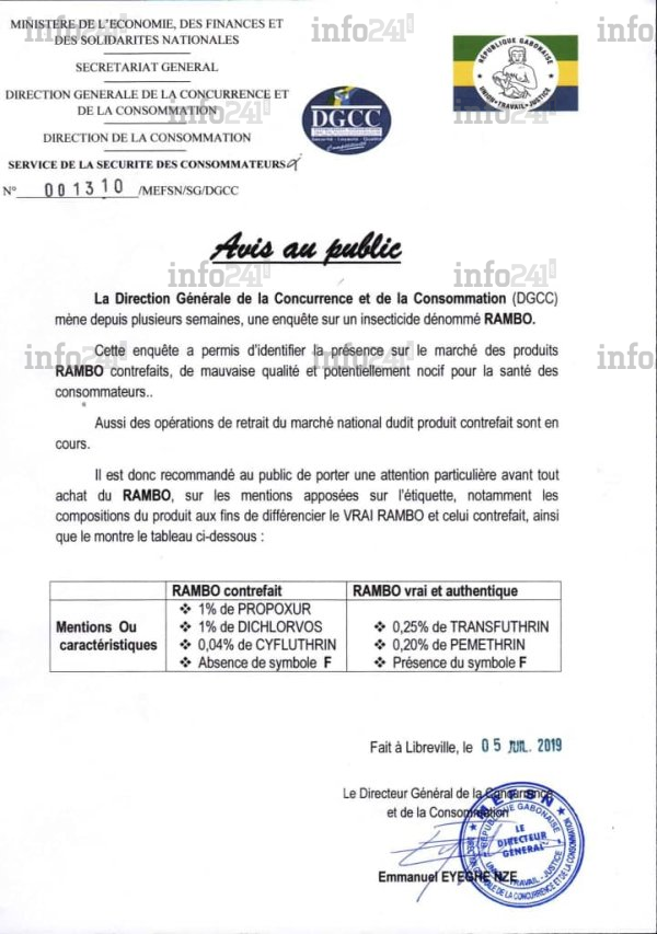 Une fois n’est pas coutume, la DGCC sonne l’alerte. Dans un communiqué parvenu ce samedi à la rédaction d’Info241 et signé de son directeur général, Emmanuel Eyeghe Nze, la DGCC dit livrer les conclusions de son enquête menée « depuis plusieurs semaines » sur un des insecticides les plus prisé des populations dénommé Rambo.