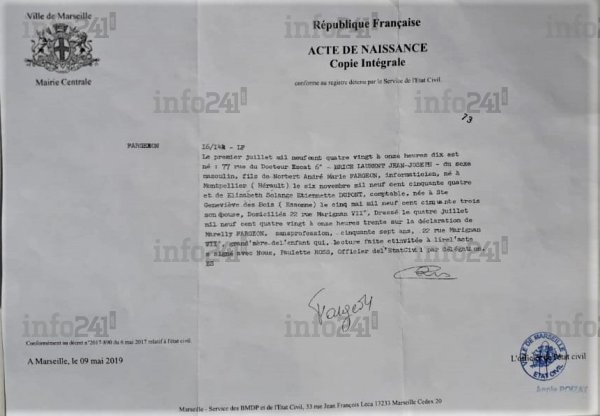 Pour le confronter à ce mensonge, des internautes gabonais établis en France ont rendu public hier soir la copie intégrale de son acte de naissance français, car né à Marseille un 1er juillet 1980. Dans le document exhibé en preuve et provenant de l’administration française, on y apprend principalement que les deux géniteurs du directeur de cabinet sont bels et bien français. Ils ont pour nom Norbert Marie André Fargeon (père) et Elisabeth Solange Étiennette Dupont (mère).