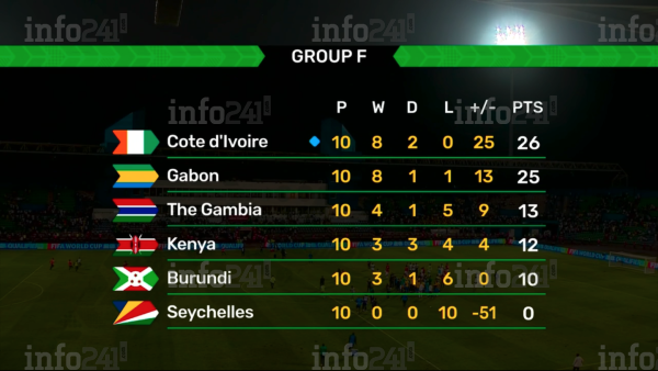 Avec ce succès, le Gabon termine deuxième du groupe F derrière la Côte d’Ivoire, invaincue. Les Panthères affichent un bilan impressionnant : 8 victoires, 1 nul et 1 défaite, avec un total de 25 points et une différence de buts de +13.