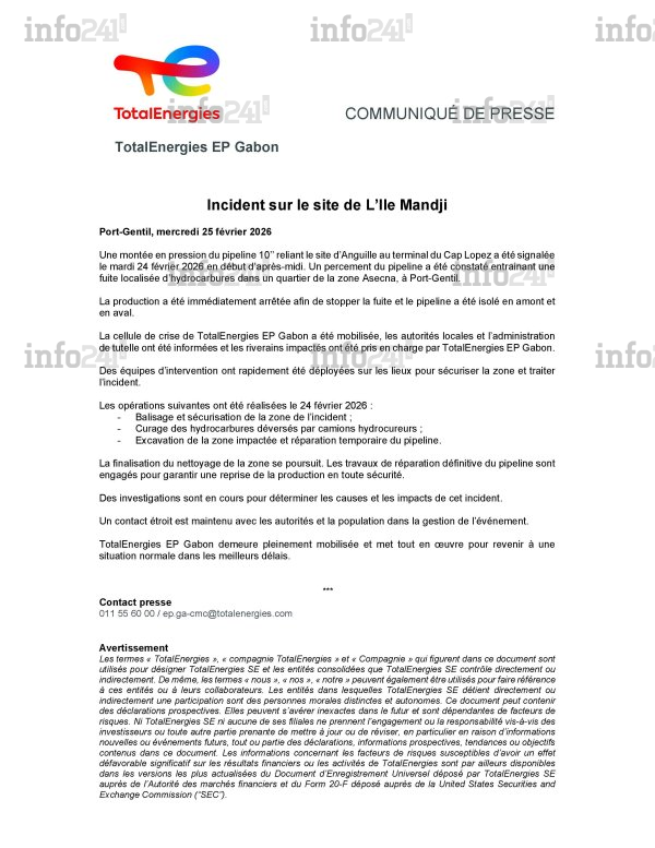 L’entreprise pétrolière TotalEnergies EP Gabon a officiellement réagi ce mercredi 25 février aux événements survenus la veille dans la capitale économique. Dans un communiqué de presse parvenu à la rédaction d’Info241, la société détaille les circonstances de l’incident qui a touché le site de l’île Mandji. Il s’agit d’une montée en pression survenue en début d’après-midi, le mardi 24 février, sur le pipeline reliant le site d’Anguille au terminal du Cap Lopez.