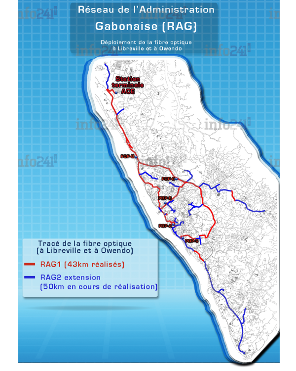 - Le projet gouvernemental Réseau de l’administration Gabonaise (RAG), qui consiste à bâtir un réseau de télécommunications destiné à améliorer le service public et à partager l’information administrative. Il s’agit d’une infrastructure haut débit, fiable et sécurisée, qui repose sur des liaisons en fibre optique et en faisceaux hertziens sur l’ensemble du territoire national.