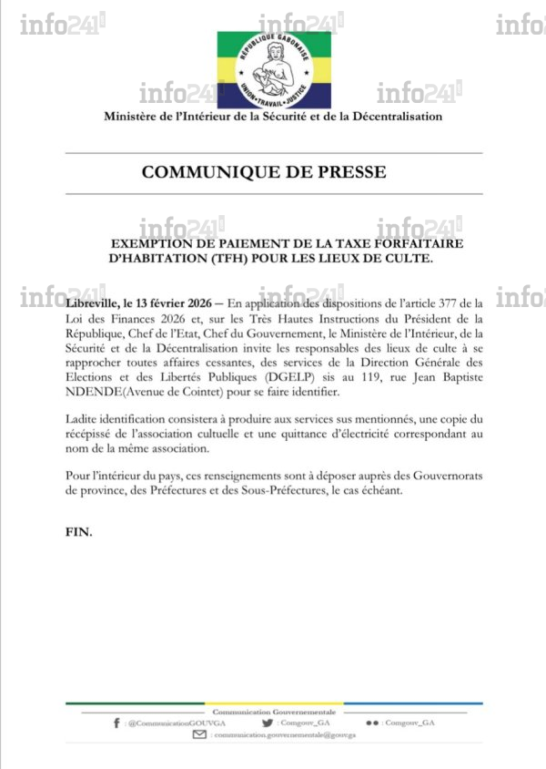 Le ministère de l’Intérieur, de la Sécurité et de la Décentralisation a annoncé, dans un communiqué daté du 13 février parvenu à Info241, l’exemption de paiement de la controversée Taxe forfaitaire d’habitation (TFH) pour les lieux de culte. Cette mesure est prise en application de l’article 377 de la Loi de finances 2026 et sur les instructions du président de la République, chef de l’État, chef du gouvernement.