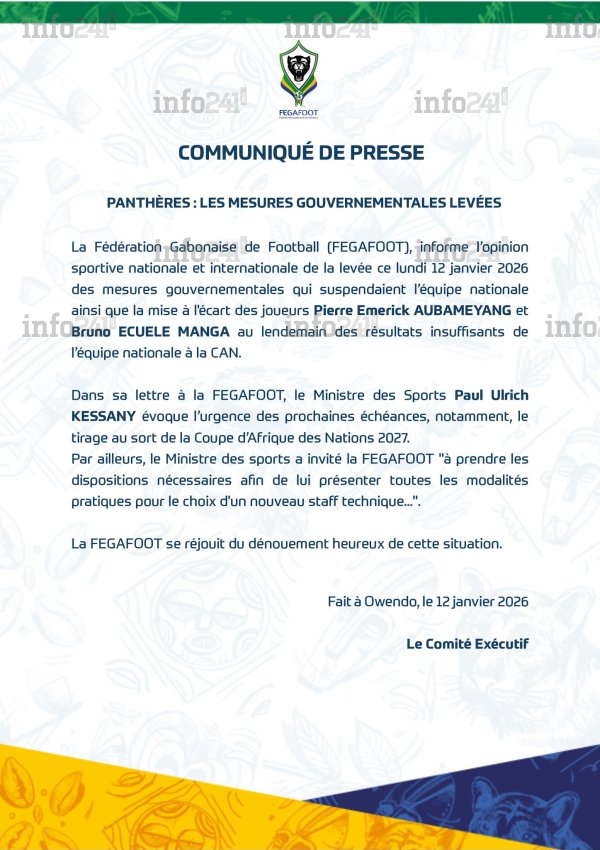 La décision annoncée ce 12 janvier marque un retour à la normale sur le papier : les Panthères ne sont plus suspendues et les deux joueurs ne sont plus officiellement écartés. La FEGAFOOT se félicite d’un « dénouement heureux », signe d’un apaisement institutionnel et d’un alignement avec l’agenda à venir, notamment la CAN 2027.
