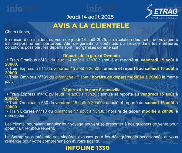 Dans un communiqué diffusé en soirée, la SETRAG annonce l’annulation et le report de plusieurs trains, aussi bien au départ d’Owendo qu’au départ de Franceville. Les trains Omnibus n°431 et Express n°410 prévus le même jeudi après-midi ont été reportés à ce vendredi 15 août à 20h00. Le Train Express n°511 du 15 août est quant à lui repoussé au samedi 16 août à la même heure, tout comme l’Omnibus n°530. Les départs prévus dimanche 17 août (Omnibus n°731 et Express n°710) sont maintenus mais avec un horaire décalé à 20h00.