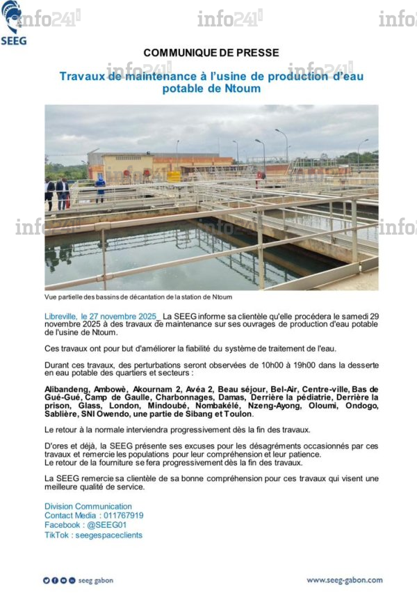 Le Grand Libreville s’apprête à traverser une nouvelle zone de turbulences hydrauliques. Dans un communiqué transmis ce jeudi 27 novembre à Info241, la Société d’énergie et d’eau du Gabon (SEEG) annonce d’importants travaux de maintenance à l’usine de production d’eau potable de Ntoum. Une opération jugée indispensable pour renforcer la fiabilité du système de traitement, mais qui entraînera des perturbations dans la distribution de l’eau dans plusieurs quartiers de la capitale.