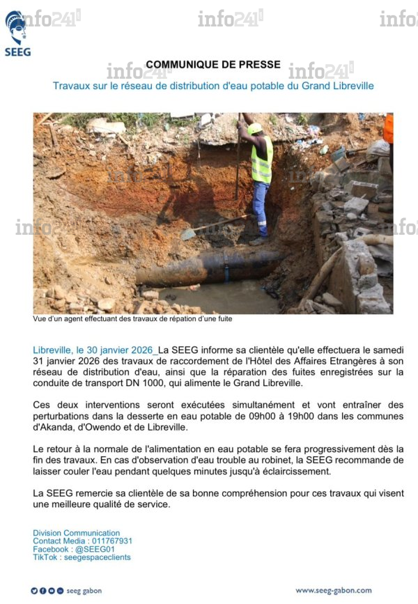 Dans ce communiqué daté de ce 30 janvier, l’opérateur précise qu’il procédera « à des travaux de raccordement de l’Hôtel des Affaires Étrangères à son réseau de distribution d’eau, ainsi que [à] la réparation des fuites enregistrées sur la conduite de transport DN 1000 », laquelle « alimente le Grand Libreville ».