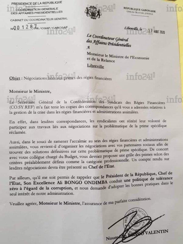 Dans son courrier adressé au ministre de l’Economie, Noureddin Bongo Valentin prend le parti de la Confédération des syndicats des régies financières (Cosyref) dans le bras de fer qui l’oppose depuis des mois à l’inertie de Jean Marie Ogandaga dans cette crise sociale. Et particulièrement son refus d’associer ladite confédération syndicale aux négociations sur la prime spécifique réclamée par les agents des régies financières. Ce contre quoi, Noureddin Valentin rappelle au ministre la volonté de son père dans ce dossier.