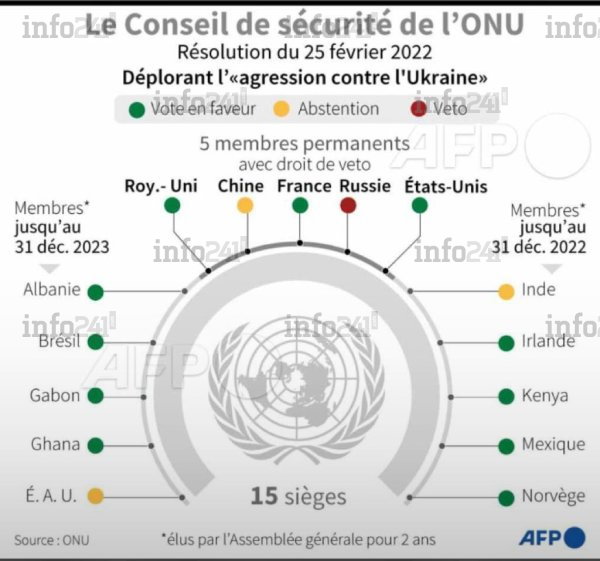 La résolution avortée réaffirmait l’attachement à la souveraineté, l’indépendance, l’unité et l’intégrité territoriale de l’Ukraine à l’intérieur de ses frontières internationalement reconnues, déplorait avec la plus grande fermeté « l’agression de la Fédération de Russie contre l’Ukraine en violation de l’article 2, paragraphe 4, de la Charte des Nations Unies ».