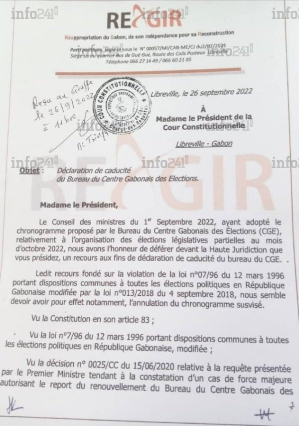 Dans sa saisine des 9 juges, Réagir rappelle que « La durée du mandat des membres du bureau du Centre gabonais des Elections est de deux ans renouvelable une fois ». Citant ainsi les dispositions de la loi n°07/96 du 12 mars 1996 portant dispositions communes à toutes les élections politiques en République gabonaise. « Or, l’actuel bureau illégal du CGE siège sans discontinuer depuis le 02 mai 2018. De même, la prorogation dont il a bénéficié par décision n°0025/CC de la Cour constitutionnelle du 15 juin 2020 » était circonscrite à la fin de la pandémie de coronavirus dans le pays.