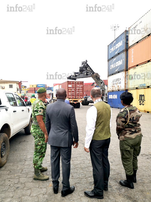 Les autorités gabonais s’assurant de la présence du bois dans les containers saisis © 2019 D.R./Info241