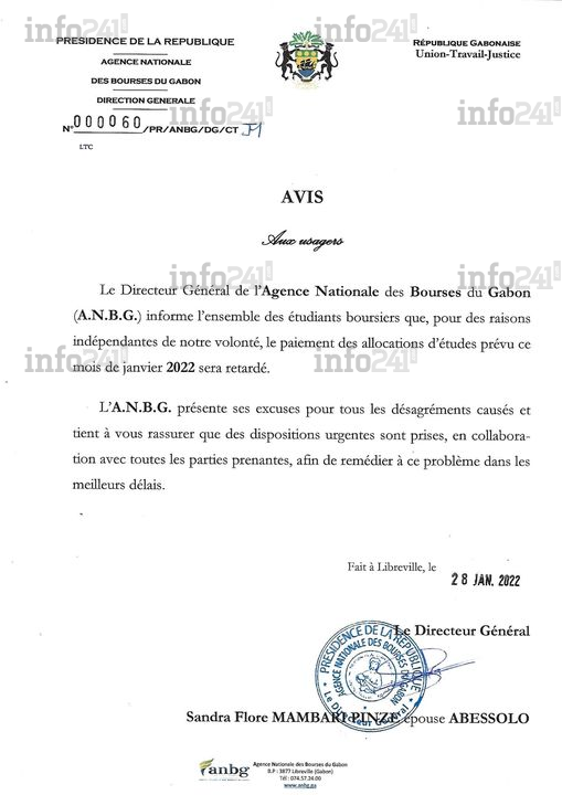 « Le directeur Général de l’Agence nationale des bourses du Gabon (A.N.B.G.) informe l’ensemble des étudiants boursiers que, pour des raisons indépendantes de notre volonté, le paiement des allocations d’études pour mois de janvier 2022 sera retardé », indique sèchement Sandra Flore Mambari Pinze Abessolo.