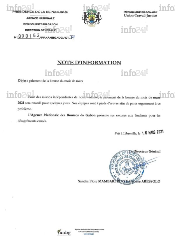 « Pour des raisons indépendantes de notre volonté, le paiement de la bourse du mois de mars 2021 sera retardé pour quelques jours », indique dans sa note d’information la directrice générale de l’ANBG Sandra Flore Mambari Pinze Abessolo. L’agence de paiement des bourses rattachée à la Présidence gabonaise indique que ses « équipes sont à pieds d’enivre afin de parer urgemment à ce problème ».