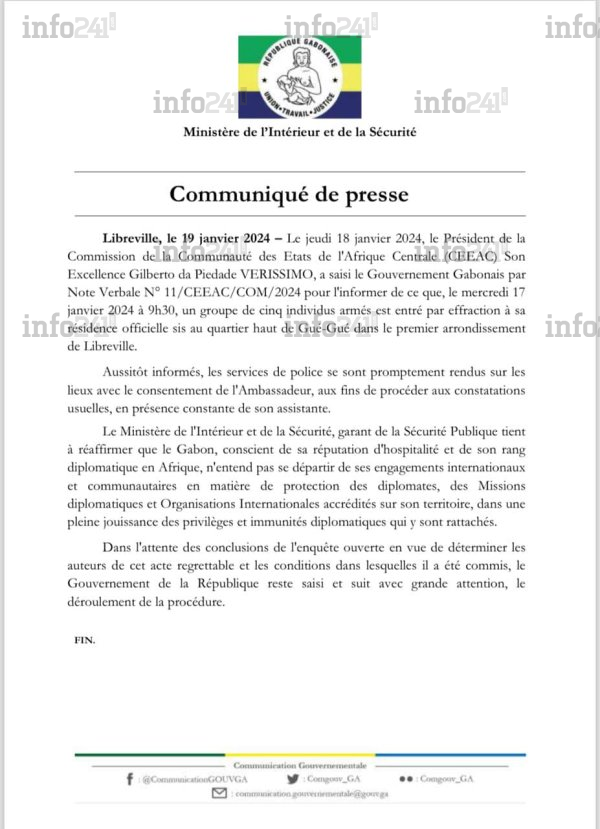 Selon le communiqué du gouvernement angolais, des hommes armés, dont certains portaient l’uniforme des forces armées gabonaises, ont envahi mercredi la résidence officielle du président de la CEEAC, agressant « psychologiquement » le président et son assistant. Le secrétaire d’État aux Affaires étrangères de l’Angola, Esmeralda Mendonça, a exprimé son mécontentement et a exigé des explications des autorités gabonaises sur les motivations d’un tel acte.