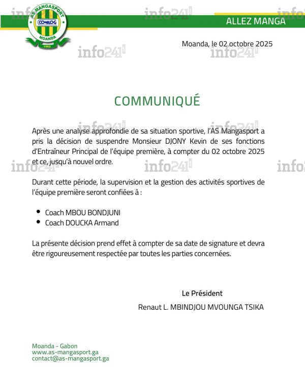 « Après une analyse approfondie de sa situation sportive, l’AS Mangasport a pris la décision de suspendre Monsieur Djony Kevin de ses fonctions d’entraîneur principal de l’équipe première, à compter du 2 octobre et ce, jusqu’à nouvel ordre », précise le texte. La gestion de l’équipe est confiée provisoirement aux coachs Mbou Bondjuni et Armand Doucka.