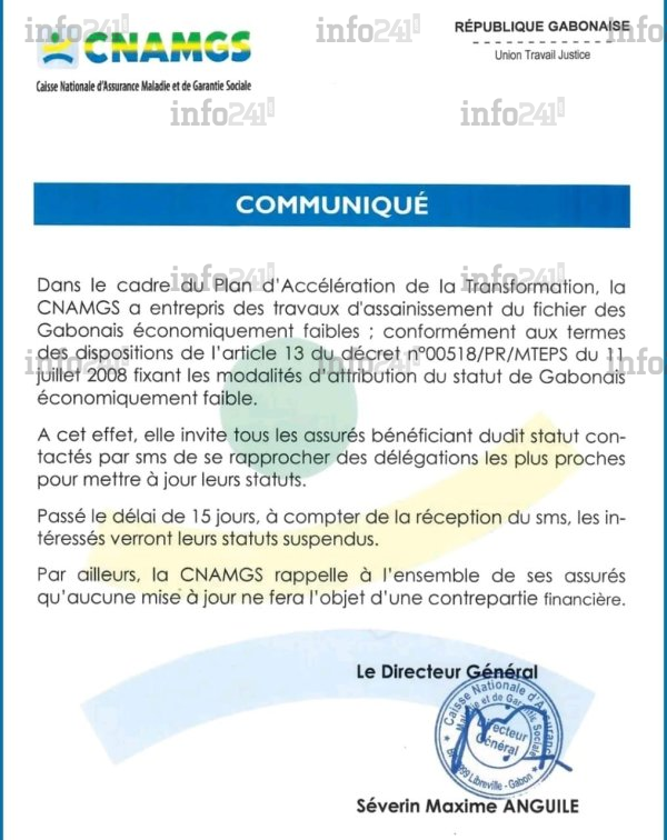 La CNAMGS menace de radier sous 15 jours ses « faux » gabonais économiquement faibles ! © 2022 D.R./Info241