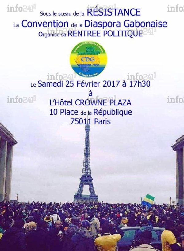 La Convention de la Diaspora Gabonaise (CDG) fera sa rentrée politique le samedi 25 février 2017 à Paris, après la traditionnelle marche de résistance, une action de concertation politique et de mise en synergie diasporique qui intervient dans un contexte de crise sociopolitique au Gabon, nous apprend ce dimanche un communiqué de presse parvenu à la rédaction d’Info241 venant du comité d’organisation de la CDG.