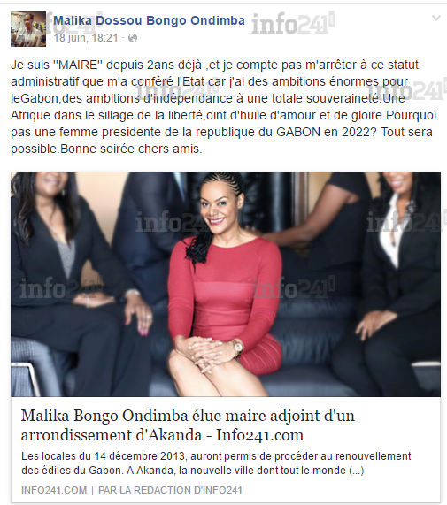 Dans le message aux allures de profession de foi, la fille d’Ali Bongo se voit bien au pouvoir comme son père et son père avant lui ! Elle y souligne : "Je suis ’’MAIRE’’ depuis 2 ans déjà, et je compte pas m’arrêter à ce statut administratif que m’a conféré l’Etat (sic)", s’est exprimé la jeune femme politique.