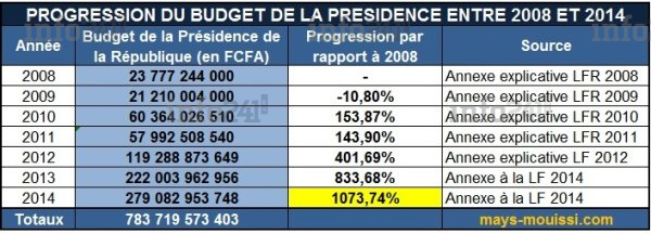En 2008 en effet, les crédits alloués à la Présidence de la République gabonaise n’étaient que de 23,8 milliards de FCFA dont 15.7 milliards furent affectés au fonctionnement et 8 milliards consacrés à l’investissement. En 2014, le budget général de la Présidence de la République s’élevait selon l’annexe au projet de Loi de finances 2014 à 279 milliards FCFA. Ainsi en 7 ans, le budget de la seule Présidence de la République a été multiplié par 11 quand le budget général de l’Etat n’était multiplié que par 1.64 (passant de 1 798 milliards en 2008 à 2 954 milliards en 2014).