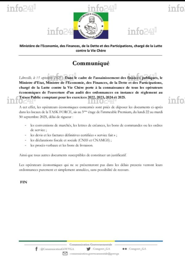 Dans son communiqué, le ministre d’État Henri Claude Oyima souligne que tous les opérateurs économiques concernés doivent impérativement présenter leurs justificatifs auprès de la Task Force, installée au 3ᵉ étage de l’immeuble Premium à Libreville. La période de dépôt est fixée du lundi 22 au mardi 30 septembre, délai qualifié de « rigueur ». L’objectif est d’établir un inventaire complet des dettes en souffrance et de déterminer leur validité.