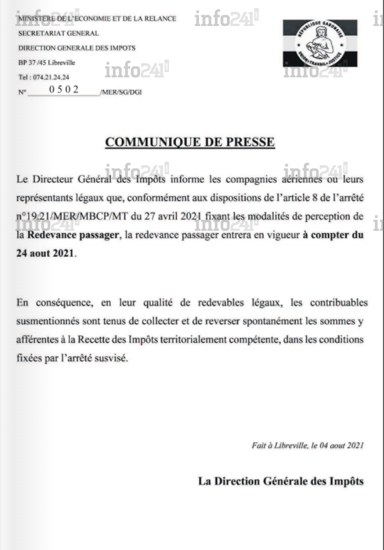 « En leur qualité de redevables légaux, les contribuables susmentionnés sont tenus de collecter et de reverser spontanément les sommes y afférentes à la recette des Impôts territorialement compétente, dans les conditions fixées par l’arrêté susvisé », martèle le communiqué aux responsables aériens. De quoi créer une nouvelle flambée des prix de billets de la destination Gabon, déjà victime de spéculation liée à la pandémie de coronavirus.