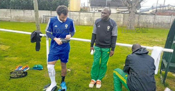 Un joueur gabonais aux cotés du staff médical des Panthères, hier à Paris