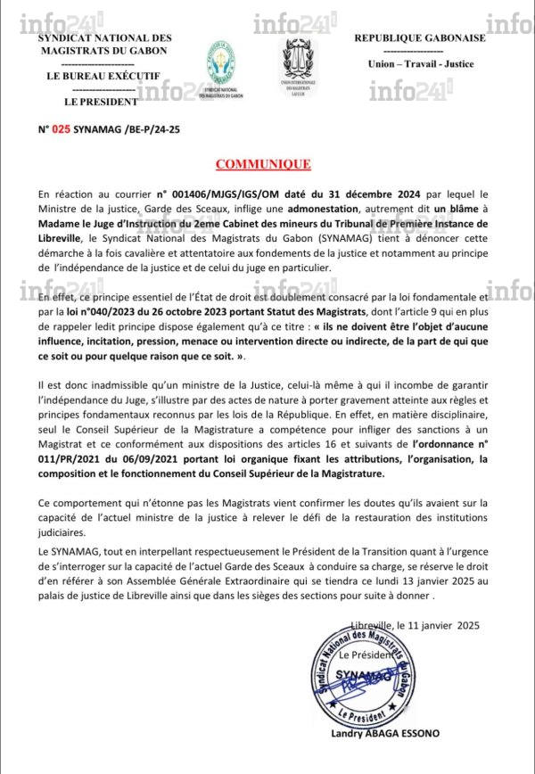 Le Syndicat national des magistrats du Gabon (SYNAMAG) a lancé une offensive contre le ministre de la Justice, Garde des Sceaux, Paul-Marie Gondjout qu’il accuse d’avoir bafoué les principes fondamentaux de l’indépendance de la magistrature. Dans un communiqué publié le 11 janvier, signé par son président Landry Abaga Essono, le SYNAMAG s’insurge contre une admonestation adressée à une juge d’instruction du Tribunal de Première Instance de Libreville. Cette sanction, qualifiée de « cavalière », est perçue comme une atteinte grave aux fondements de l’État de droit.