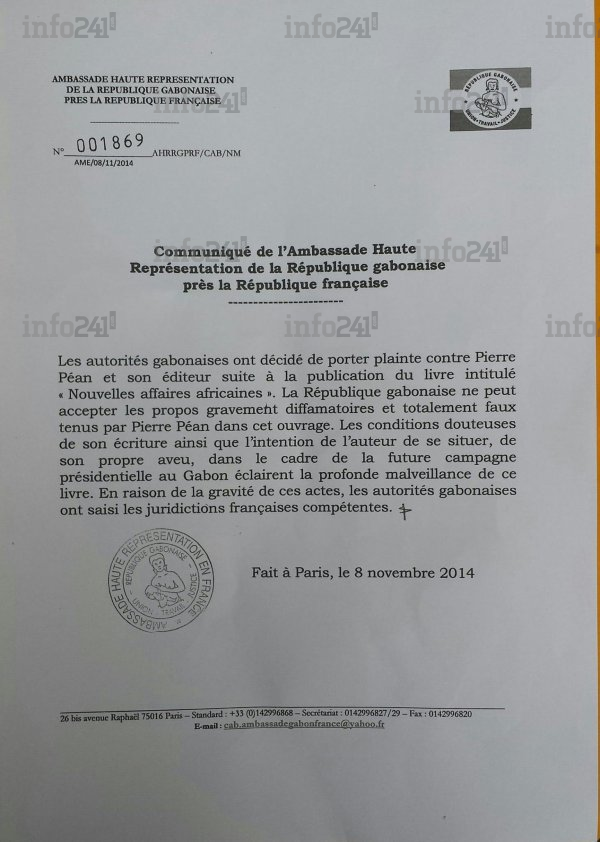 Après que plusieurs gabonais ne comprenant toujours pas pourquoi le « Gabon » outragé par les révélations, n’ai instruit des poursuites judiciaires, l’option judiciaire serait bien dans le viseur des « autorités gabonaises ». ! Un communiqué de la Haute Représentation gabonaise en France, daté du samedi 8 novembre, informe et motive cette décision de poursuivre sur les juridictions françaises, Pierre Péan et les éditions Fayard.