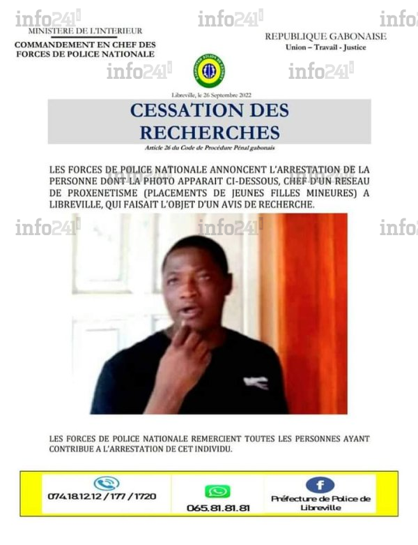 Deux semaines après le lancement d’un avis de recherche contre ce présumé proxénète, la préfecture de police de la capitale gabonaise a annoncé ce mardi 27 septembre en début de journée, la cessation des recherches. « Les Forces de police nationale annoncent l’arrestation de la personne dont la photo apparaît ci-dessous, chef du réseau de proxénétisme (placements de jeunes filles mineures) à Libreville. Il faisait l’objet d’un avis de recherche lancé par les forces de police nationale », précise le communiqué de la préfecture de Libreville.