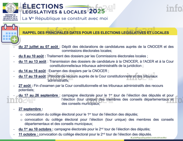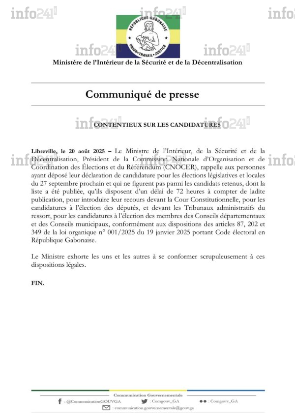 Dans un communiqué daté du mercredi 20 août mais rendu public ce jeudi, le ministre détaille que « les candidats non retenus disposent d’un délai de 72 heures à compter de la publication des listes pour saisir les juridictions compétentes : la Cour constitutionnelle pour les législatives, les tribunaux administratifs pour les élections locales ». Il exhorte par ailleurs tous les candidats concernés à respecter scrupuleusement ces procédures légales.