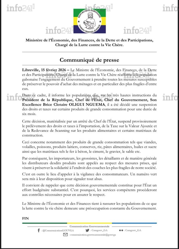 Vie chère au Gabon : Le gouvernement suspend les taxes des produits de première nécessité pour 6 mois © 2026 D.R./Info241