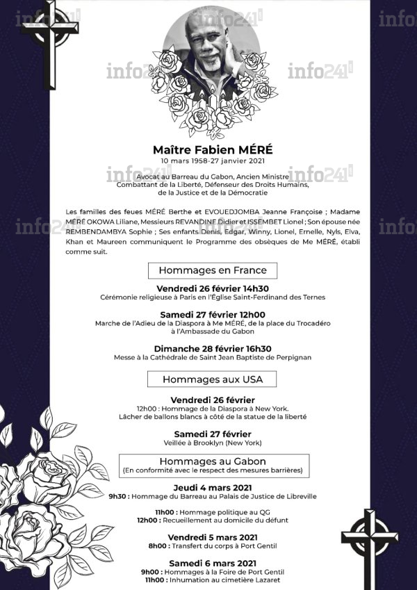 En terre gabonaise, des hommages seront finalement rendus à Maître Fabien Méré en conformité avec les respect des mesures barrières. Jeudi 04 mars à 9h30 un hommage lui sera rendu par le barreau gabonais au Palais de justice de Libreville - 11h00 : hommage politique au QG de Jean Ping - 12h00 : recueillement au domicile du défunt. Vendredi 05 mars : transfert du corps à Port-Gentil. Samedi 06 mars : hommages à la foire de Port-Gentil - 11h00 : inhumation au cimetière Lazaret.