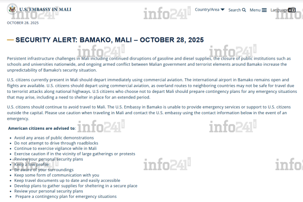 Mali : L’ambassade des États-Unis ordonne à ses citoyens de quitter le pays sans délai © 2025 D.R./Info241