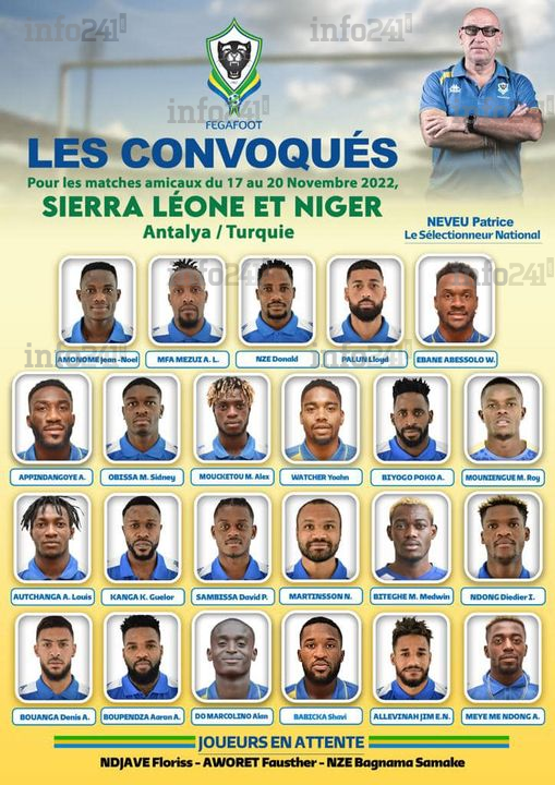 Une liste de joueurs sans grand changement avec les retours en défense d’Aaron Appindangoye et Ebane Abessolo. Mais aussi l’absence remarquée de Bruno Ecuelé Manga écarté car n’ayant toujours pas de club en Europe. Coté joueurs locaux du National Foot, Patrice Neveu n’a fait appel qu’à Roy Mouniengue (Stade Mandji) même si Samake Nze Bagnama (CF Mounana) reste en attente. Le milieu de terrain Ibrahim Ndong écarté pour indiscipline fait à quant lui son grand retour en sélection.