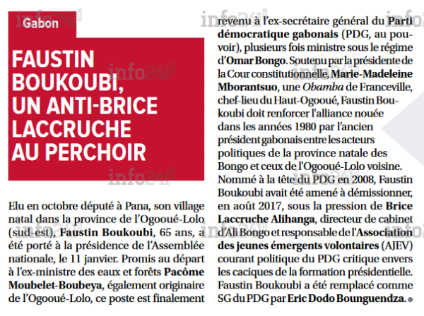 Selon nos confrères très aux faits des confidences de pouvoir, Marie Madeleine Mborantsuo aurait soutenu à cette élection qui a eu lieu le 11 janvier, Faustin Boukoubi. Ce, afin que par cette nomination Faustin Boukoubi « renforce l’alliance nouée dans les années 1980 par l’ancien président gabonais (Omar Bongo, ndlr) entre les acteurs politiques de la province natale des Bongo (Haut-Ogoouée dont est originaire Mborantsuo) et ceux de l’Ogooué-Lolo voisine ».