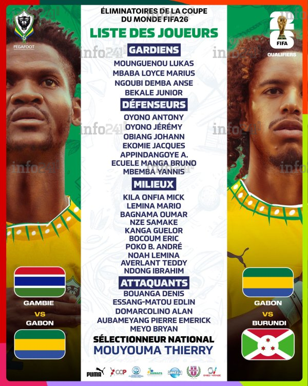 Le sélectionneur gabonais Thierry Mouyouma a devoilé ce vendredi la liste des 26 joueurs convoqués pour les deux derniers matchs des éliminatoires de la Coupe du monde 2026. Les Panthères affronteront la Gambie au Safaricom Stadium de Kasarani près de Nairobi (Kenya) le 10 octobre, puis le Burundi à Franceville le 14 octobre, dans des rencontres décisives pour leurs espoirs de qualification.