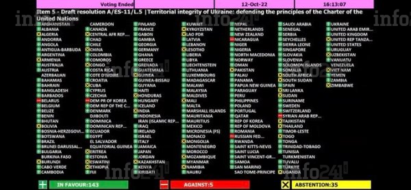 La résolution déclare que « les actes illicites de la Fédération de Russie concernant les soi-disant référendums illégaux organisés du 23 au 27 septembre 2022 dans des parties des régions ukrainiennes de Donetsk, de Kherson, de Louhansk et de Zaporijjia qui se trouvent ou se sont trouvées en partie sous le contrôle militaire temporaire de la Fédération de Russie ainsi que la tentative d’annexion illégale de ces régions qui a suivi n’ont aucune validité au regard du droit international et ne sauraient servir de fondement à une quelconque modification du statut de ces régions d’Ukraine ».