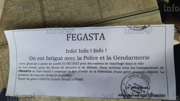 La Fédération gabonaise des syndicats des transporteurs et assimilés (Fegasta) a annoncé ce samedi 19 mars qu’elle rentra finalement en grève générale illimitée ce lundi 21 mars dès 07 heures suite au non respect des décisions de la part du gouvernorat de l’Ogooué-Maritime. En effet, le vendredi 11 mars dernier la FEGASTA avait lancé à Port-Gentil une grève générale illimitée afin de mettre un terme au racket régulier effectué par les agents de la police et de la gendarmerie nationale.