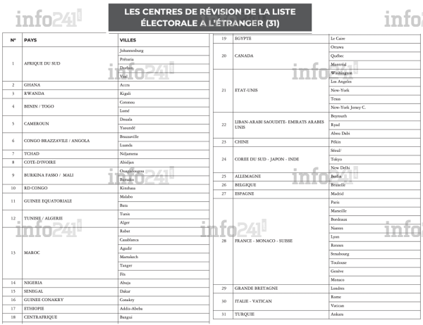 Voici la liste des pays et centre de vote autorisés à voter ce samedi 26 aout à l’étranger conformément à ce décret exceptionnel :