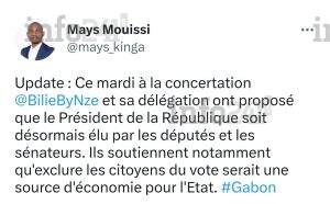 Le mercredi 22 février 2023, alors qu’il était encore à la primature, Alain-Claude Billie By Nzé aurait suggéré, lors de la concertation politique de 10 jours convoquée par Ali Bongo, que l’élection présidentielle se fasse dorénavant par le Parlement. Une proposition relayée par l’analyste économique de l’époque Mays Mouissi, qui affirmait sur Twitter, aujourd’hui X.