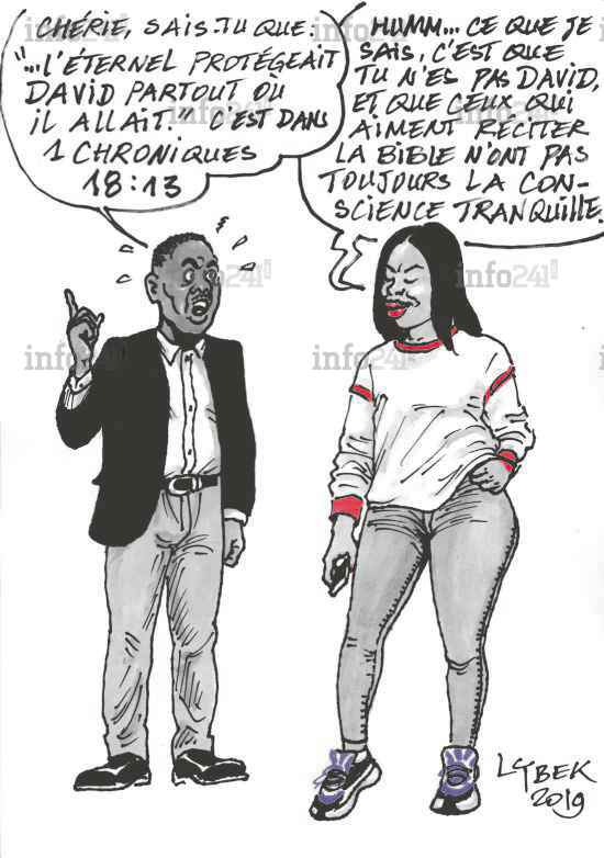 Comme pour conjurer cette mauvaise nouvelle pour son avenir, l’ancien ministre Ajevien a invoqué les Saintes écritures « ... L’Eternel protégeait David partout où il allait ». Comme pour dire qu’il était le David que Dieu protégerait partout y irait contre ses ennemis qui l’ont évincé du gouvernement. Ce à quoi Lybek répond avec détour dans sa caricature « Hum... Ce que je sais, c’est que tu n’es pas David ». Avant de rajouter finement « Ceux qui aiment réciter la Bible n’ont pas la conscience tranquille ».