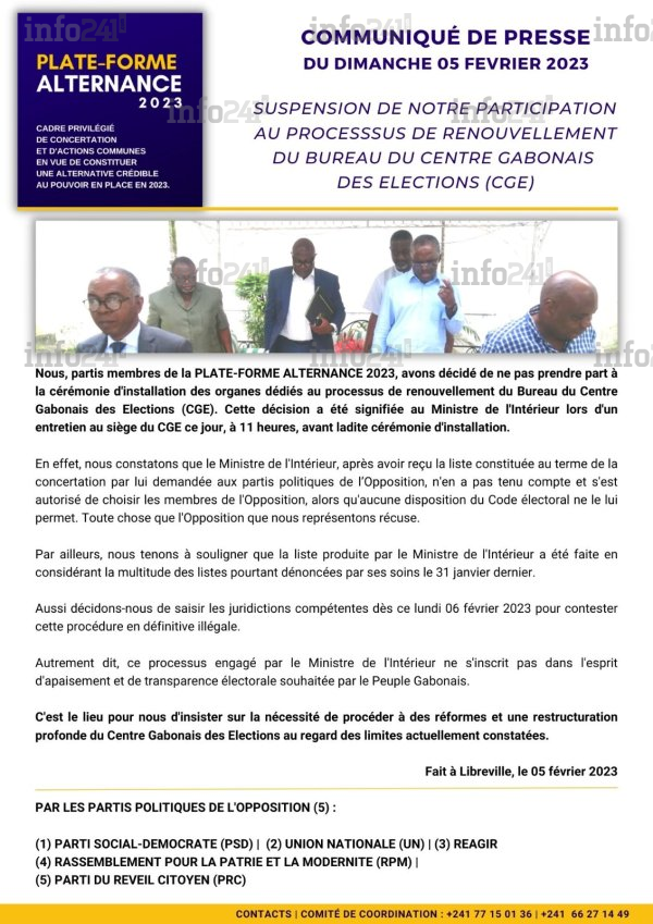Et d’expliquer : « Nous, partis membres de la PLATE-FORME ALTERNANCE 2023, avons décidé de ne pas prendre part à la cérémonie d’installation des organes dédiés au processus de renouvellement du Bureau du Centre Gabonais des Elections (CGE). Cette décision a été signifiée au Ministre de l’Intérieur lors d’un entretien au siège du CGE ce jour, à 11 heures, avant ladite cérémonie d’installation ».