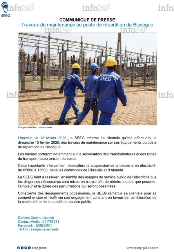 SEEG : Une grosse coupure d’électricité prévue ce dimanche matin à Libreville et Akanda © 2026 D.R./Info241