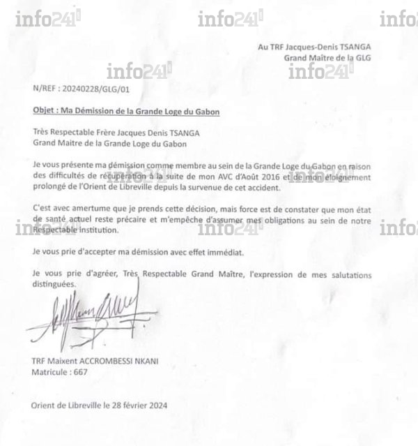« C’est avec amertume que je prends cette décision », indique-t-il dans sa lettre adressé au grand maitre Jacques Denis Tsanga. « Mais force et de constater que mon état de santé actuel reste précaire et m’empêche d’assumer mes obligations au sein de notre respectable institution », reconnait l’ancien membre de cette loge dont sont membres plusieurs hauts cadres politiques et autres personnalités publiques gabonaises.