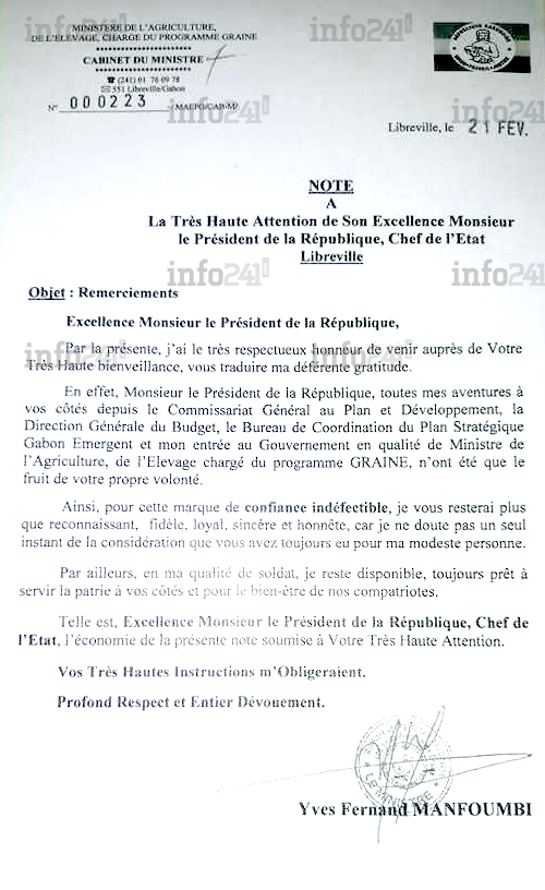Dans cette lettre qui a fuité aujourd’hui sur la toile, le ministre déchu signe sa missive de « remerciements » avec le sceau de son ministère et son cachet officiel. Yves Fernand Manfoumbi y tente de « traduire » à Ali Bongo sa « déférente gratitude » pour l’avoir promu au commissariat général au Plan et Développement, à la direction générale du Budget, à la tête du bureau de coordination du Plan stratégique Gabon émergent (PSGE) puis dernièrement au ministère de l’Agriculture.